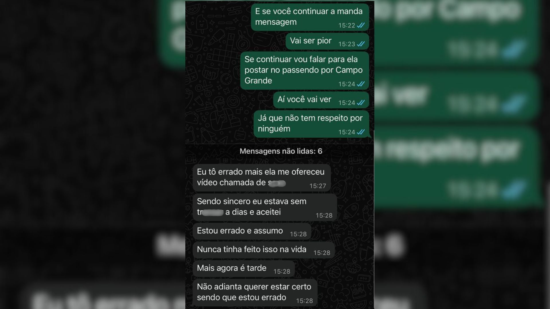 Após tomar conhecimento do caso, a esposa do policial ameaçou expor o servidor, momento em que ele admitiu o erro e culpou a vítima. “Eu tô errado, mas ela me ofereceu vídeo chamada… Estou errado e assumo. Nunca tinha feito isso na vida, mas agora é tarde”, falou o suspeito à esposa.